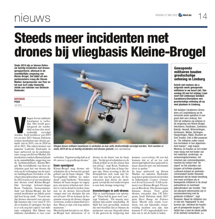 Sinds 2019 werden er binnen Defensie 16 incidenten met drones gerapporteerd. Deze vonden allemaal plaats in de onmiddellijke omgeving van de vliegbasis van Kleine-Brogel. Dat blijkt uit een parlementaire vraag die Steven Matheï, burgemeester van Peer en tot voor kort CD&V-Kamerlid, stelde aan minister van Defensie Dedonder. “Deze cijfers bevestigen de algemene trend van een toenemend aantal incidenten met drones. Ze vormen een steeds groter gevaar voor de vliegveiligheid en militaire veiligheid in ons land,” aldus Matheï.