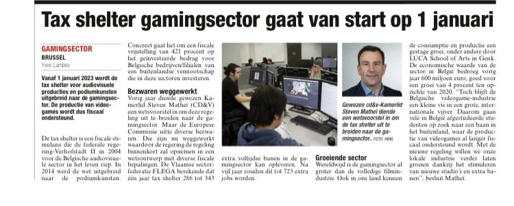Vanaf 1 januari 2023 wordt bestaande tax shelter voor audiovisuele producties en podiumkunsten uitgebreid naar de gamingindustrie en bijgevolg de productie van videogames fiscaal ondersteund. Vorig jaar werd in de commissie Financiën van de Kamer het wetsvoorstel van Steven Matheï, tot voor kort CD&V-Kamerlid, in eerste lezing goedgekeurd. Nu werd er ook binnen de regering een akkoord bereikt. “Op die manier worden investeringen in de sector aangemoedigd en kunnen we brain drain van alumni's 'game development' richting het buitenland een halt toe roepen,” aldus Matheï.