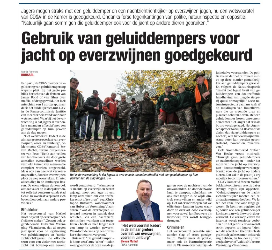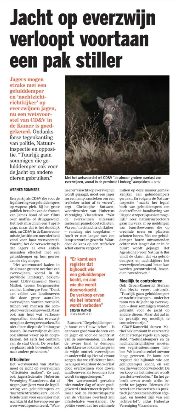 De legalisering van nachtkijkers en geluiddempers voor de everzwijnenjacht kende in de commissie alvast zijn goedkeuring. Ook in de plenaire kende het voorstel grote steun.