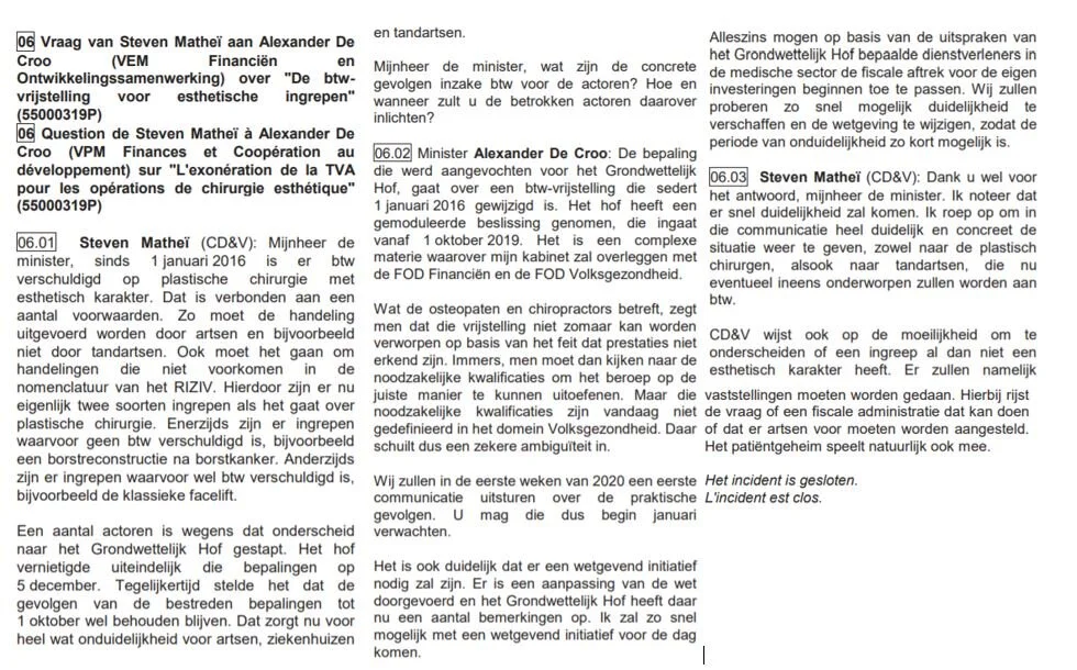 12 december 2019 - mondelinge vraag aan minister De Croo over de btw-vrijstelling voor esthetische ingrepen